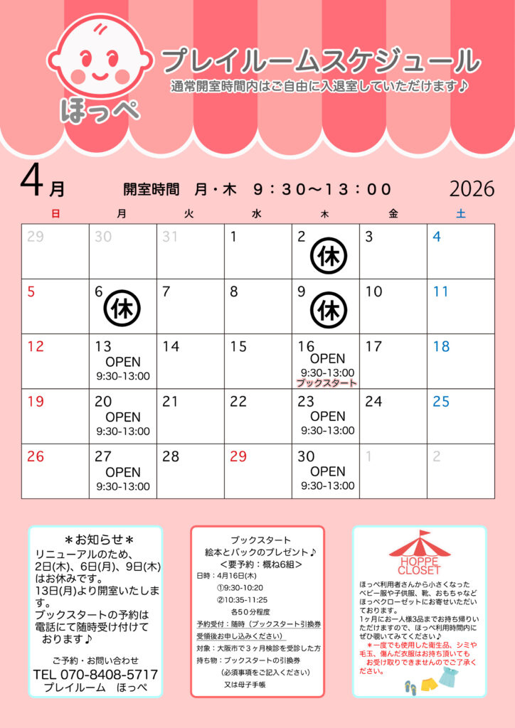 大阪市で3ヶ月検診を受診されたお子さまに、絵本とバッグをプレゼントしています。ブックスタート引換券をお持ちの方は、お電話にてご予約ください。
